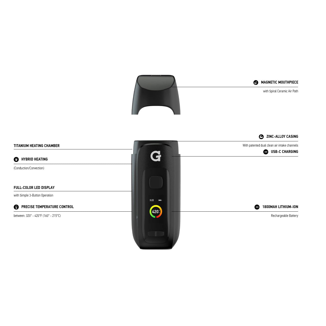 Hybrid Heating Technology: Combines convection and conduction in a titanium chamber for fast, even heating.