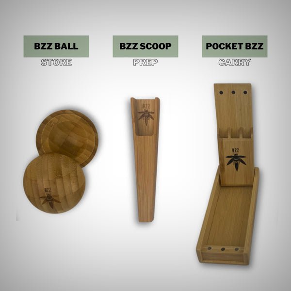 The Bzz Bamboo Accessory Bundle makes your stash life easier with three thoughtfully designed bamboo tools — whether you're storing at home, loading up to roll, or heading out the door.
