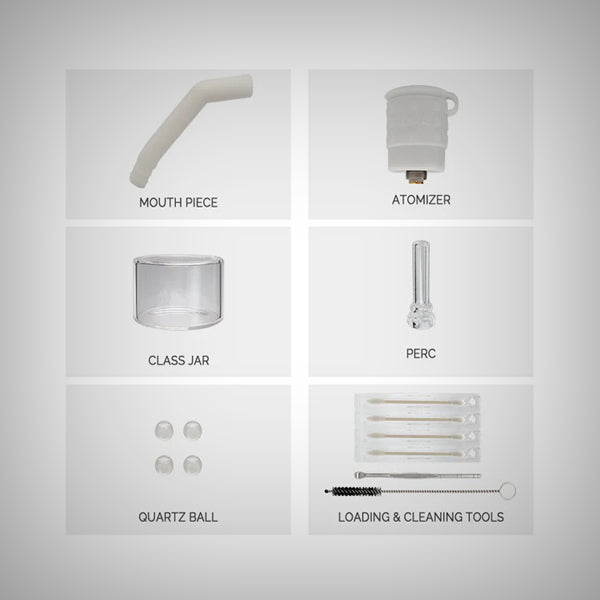 E-Rig, mouthpiece, 2 atomizers, honeycomb percolator, glass jar, cotton swab, USB-C cable, loading tool, 4 quartz balls